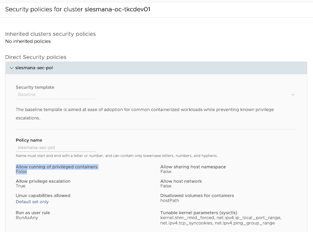 In Tanzu Misison Control (TMC), we can quickly do that by assigning Security Policy to the target Kubernetes cluster. Here in the sample I create a Security Policy using baseline security template and apply it to my cluster slesmana-oc-tkcdev01. Baseline security template include configuration to NOT allow running of privileged containers as seen below in the screenshot.